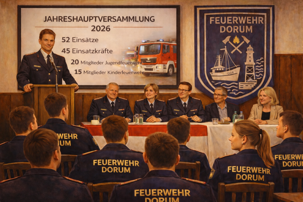 Am 13. Februar 2026 fand die Jahreshauptversammlung der Feuerwehr Dorum im „Deutschen Haus“ statt. Ortsbrandmeister Michael Pakusch begrüßte 28 Kameraden sowie sieben Gäste.