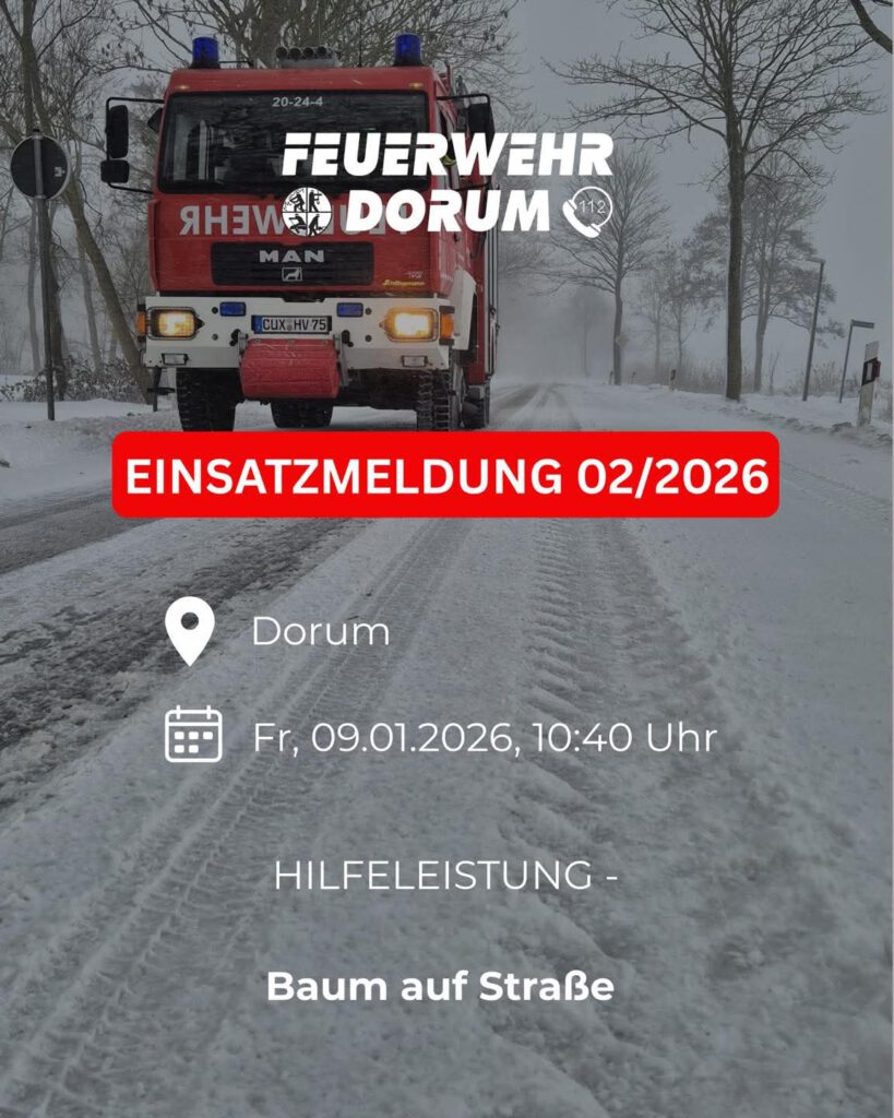 Am Freitagmorgen, den 9. Januar 2026, wurden wir aufgrund des Sturm- bzw. Wintertiefs Ellie zu einem umgestürzten Baum auf die Blickhausener Landstraße in Dorum alarmiert.