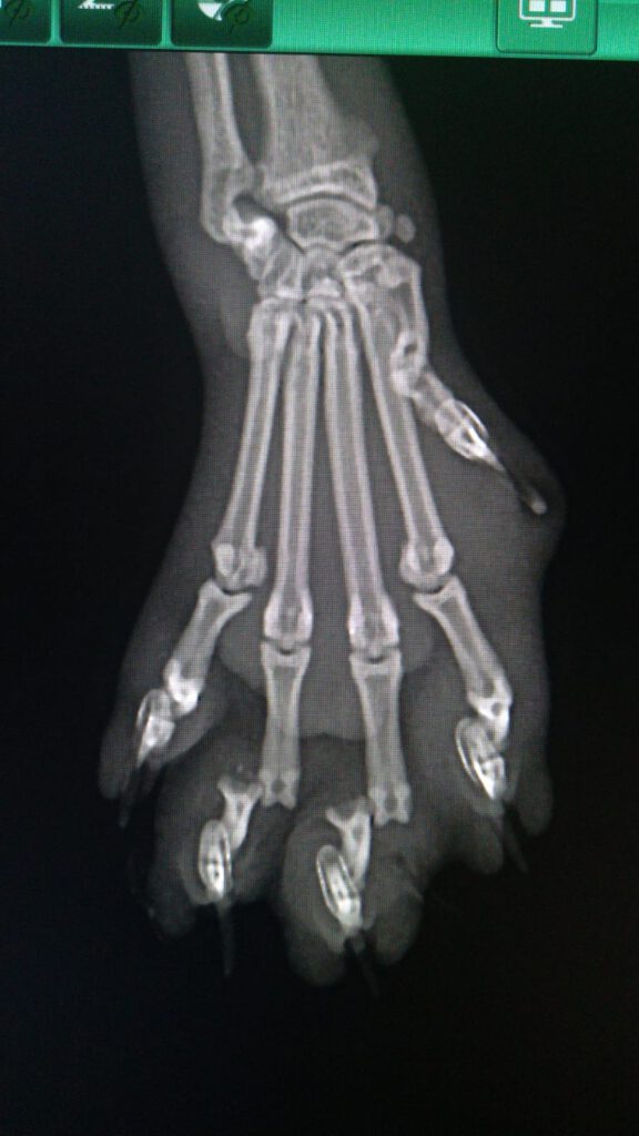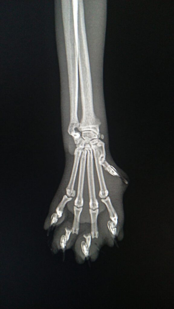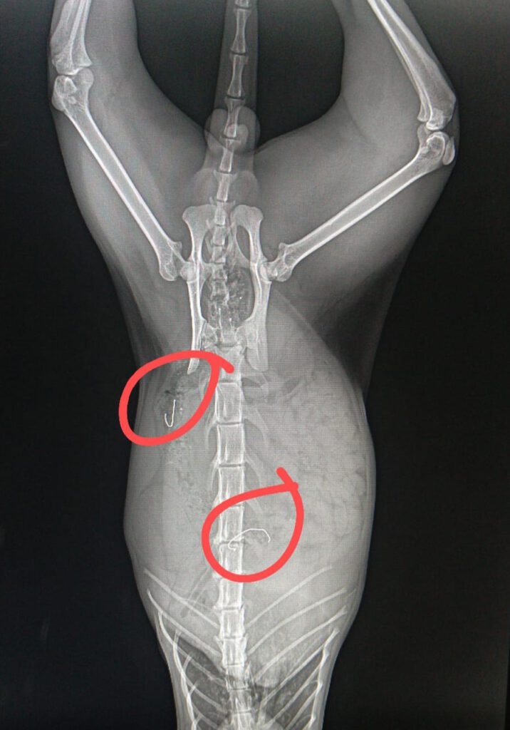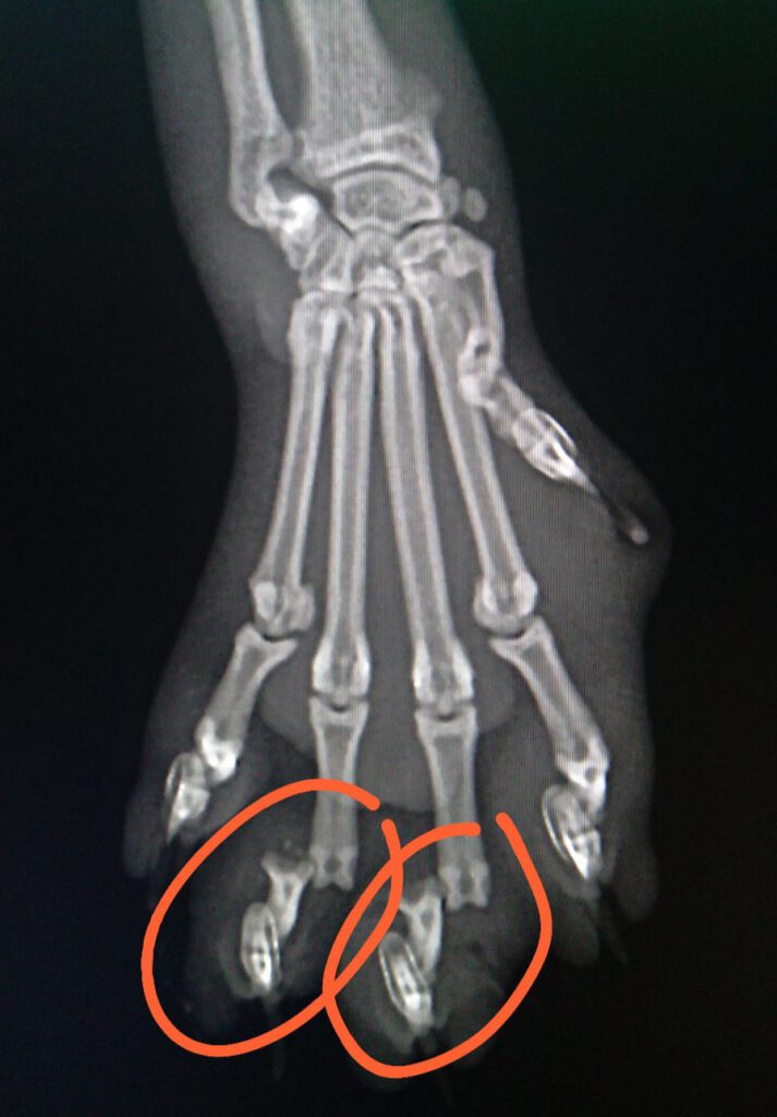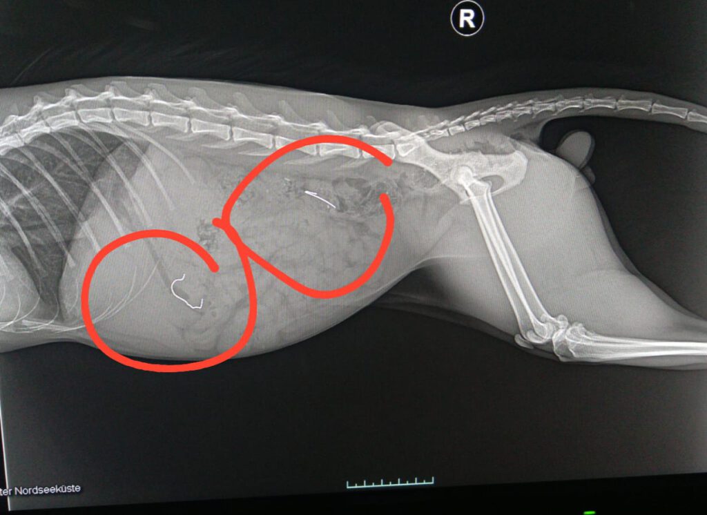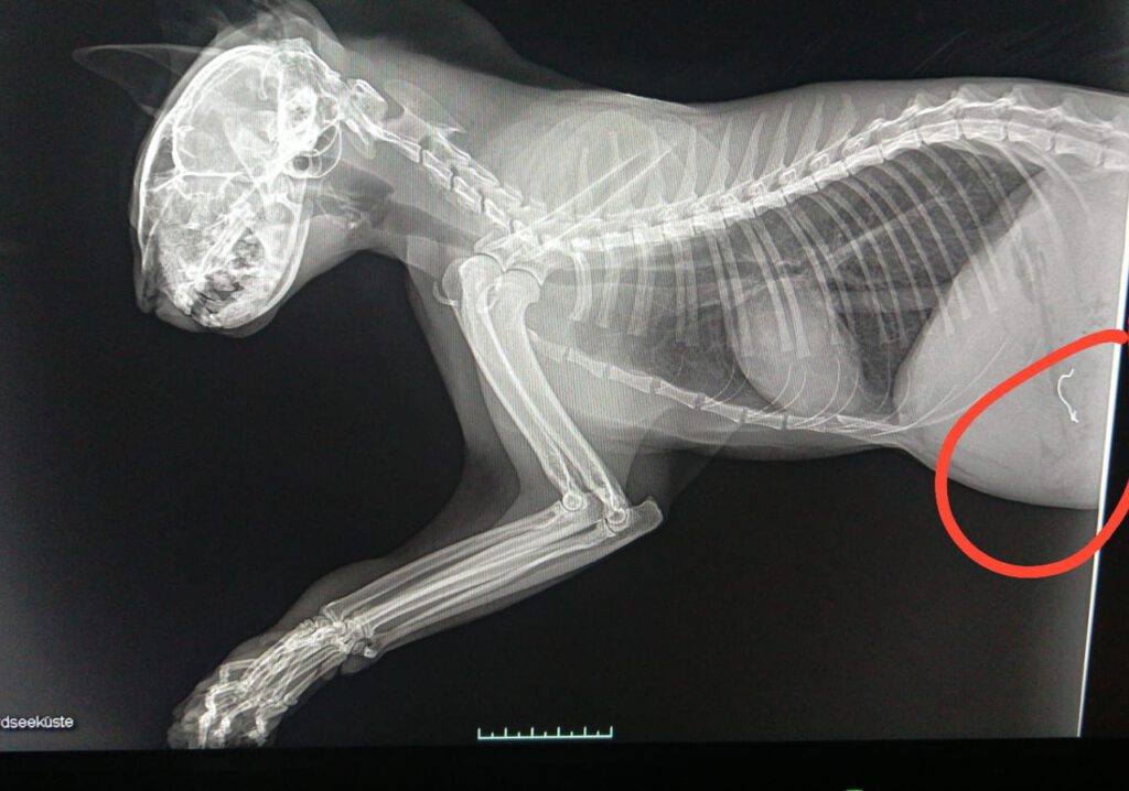 In der anschließenden Behandlung stellte sich heraus, dass die Katze neben erheblichen Verletzungen an der Pfote auch metallische Gegenstände, vermutlich die Befestigung des Köders, in Körper hatte. Die Veröffentlichung der Röntgenbilder wurden vom Tierarzt genehmigt.